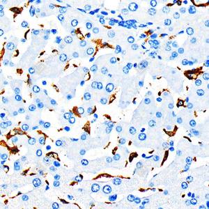 IHC检测CD163蛋白(货号 GB115709). 样品: 人肝, 4%多聚甲醛 (货号G1101) 固定12-24小时. 抗原修复: 柠檬酸抗原修复液(干粉, pH 6.0) (G1201), 98℃, 20分钟. —抗: 1: 1000稀释, 4℃ 孵育过夜. 二抗: S-vision免疫组化多聚二抗(山羊抗兔),即用型 (货号G1302), 室温孵育20分钟. |