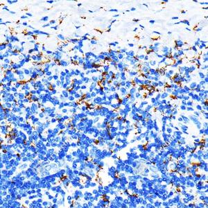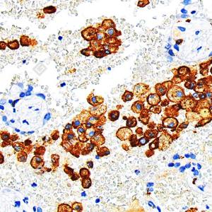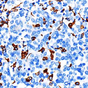 IHC检测CD163蛋白(货号 GB115709). 样品: 人扁桃体, 4%多聚甲醛 (货号G1101) 固定12-24小时. 抗原修复: 柠檬酸抗原修复液(干粉, pH 6.0) (G1201), 98℃, 20分钟. —抗: 1: 1000稀释, 4℃ 孵育过夜. 二抗: S-vision免疫组化多聚二抗(山羊抗兔),即用型 (货号G1302), 室温孵育20分钟. |