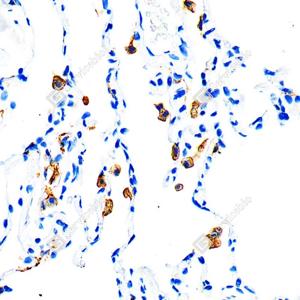 IHC检测CD163蛋白(货号 GB115709). 样品: 人肺, 4%多聚甲醛 (货号G1101) 固定12-24小时. 抗原修复: 柠檬酸抗原修复液(干粉, pH 6.0) (G1201), 98℃, 20分钟. —抗: 1: 1000稀释, 4℃ 孵育过夜. 二抗: S-vision免疫组化多聚二抗(山羊抗兔),即用型 (货号G1302), 室温孵育20分钟. |