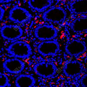 IF检测CD163蛋白(货号 GB115709)(红色). 样品: 人结肠, 4%多聚甲醛 (货号G1101) 固定12-24小时. 抗原修复: Tris-EDTA抗原修复液(pH 9.0) (G1203), 98℃, 20分钟. 封闭: 3% BSA(货号GC305010)的PBS溶液, 室温孵育30分钟. —抗: 1: 1000稀释, 4℃ 孵育过夜. 二抗: Cy3标记山羊抗兔IgG (H+L) (货号GB21303), 1: 300稀释, 室温孵育1小时. |