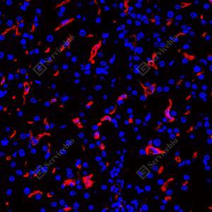 IF检测CD163蛋白(货号 GB115709)(红色). 样品: 人肝, 4%多聚甲醛 (货号G1101) 固定12-24小时. 抗原修复: Tris-EDTA抗原修复液(pH 9.0) (G1203), 98℃, 20分钟. 封闭: 3% BSA(货号GC305010)的PBS溶液, 室温孵育30分钟. —抗: 1: 1000稀释, 4℃ 孵育过夜. 二抗: Cy3标记山羊抗兔IgG (H+L) (货号GB21303), 1: 300稀释, 室温孵育1小时. |