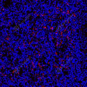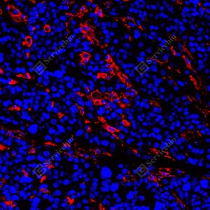 IF检测CD163蛋白(货号 GB115709)(红色). 样品: 人扁桃体, 4%多聚甲醛 (货号G1101) 固定12-24小时. 抗原修复: Tris-EDTA抗原修复液(pH 9.0) (G1203), 98℃, 20分钟. 封闭: 3% BSA(货号GC305010)的PBS溶液, 室温孵育30分钟. —抗: 1: 1000稀释, 4℃ 孵育过夜. 二抗: Cy3标记山羊抗兔IgG (H+L) (货号GB21303), 1: 300稀释, 室温孵育1小时. |