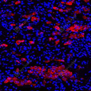 IF检测CD163蛋白(货号 GB115709)(红色). 样品: 人肝癌, 4%多聚甲醛 (货号G1101) 固定12-24小时. 抗原修复: Tris-EDTA抗原修复液(pH 9.0) (G1203), 98℃, 20分钟. 封闭: 3% BSA(货号GC305010)的PBS溶液, 室温孵育30分钟. —抗: 1: 1000稀释, 4℃ 孵育过夜. 二抗: Cy3标记山羊抗兔IgG (H+L) (货号GB21303), 1: 300稀释, 室温孵育1小时. |