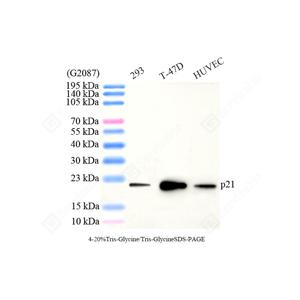 | WB检测p21蛋白(货号 GB150038). 样品: 经RIPA裂解液(货号G2002)处理的蛋白质. 封闭: 3%脱脂牛奶(货号GC310001)溶于TBST溶液, 室温孵育1小时. —抗: 1: 1000稀释, 4℃ 孵育过夜. 二抗: HRP标记山羊抗兔IgG (H+L) (货号GB23303), 1: 5000稀释, 室温孵育1小时. |