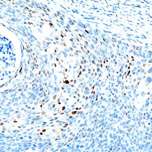 | IHC检测p21蛋白(货号 GB150038). 样品: 人宫颈癌, 4%多聚甲醛 (货号G1101) 固定12-24小时. 抗原修复: 柠檬酸抗原修复液(干粉, pH 6.0) (G1201), 高压锅均匀喷气计时2分钟. —抗: 1: 500稀释, 4℃ 孵育过夜. 二抗: S-vision免疫组化多聚二抗(山羊抗兔),即用型 (货号G1302), 室温孵育20分钟. |