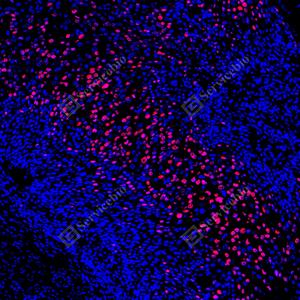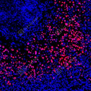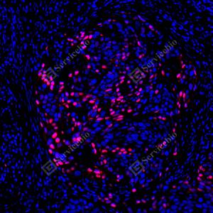 | IF检测p21蛋白(货号 GB150038)(红色). 样品: 人宫颈癌, 4%多聚甲醛 (货号G1101) 固定12-24小时. 抗原修复: 柠檬酸抗原修复液(干粉, pH 6.0) (G1201), 高压锅均匀喷气计时2分钟. 封闭: 3% BSA(货号GC305010)的PBS溶液, 室温孵育30分钟. —抗: 1: 300稀释, 4℃ 孵育过夜. 二抗: Cy3标记山羊抗兔IgG (H+L) (货号GB21303), 1: 300稀释, 室温孵育1小时. |