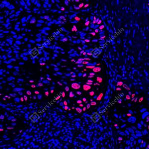 | IF检测p21蛋白(货号 GB150038)(红色). 样品: 人皮肤鳞状细胞癌, 4%多聚甲醛 (货号G1101) 固定12-24小时. 抗原修复: 柠檬酸抗原修复液(干粉, pH 6.0) (G1201), 高压锅均匀喷气计时2分钟. 封闭: 3% BSA(货号GC305010)的PBS溶液, 室温孵育30分钟. —抗: 1: 300稀释, 4℃ 孵育过夜. 二抗: Cy3标记山羊抗兔IgG (H+L) (货号GB21303), 1: 300稀释, 室温孵育1小时. |