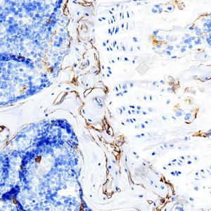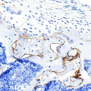 | IHC检测Osteopontin蛋白(货号 GB120020). 样品: 小鼠骨, 4%多聚甲醛 (货号G1101) 固定12-24小时. 抗原修复: Tris-EDTA抗原修复液(pH 9.0) (G1203), 98℃, 20分钟. —抗: 1: 500稀释, 4℃ 孵育过夜. 二抗: S-vision免疫组化多聚二抗(山羊抗小鼠), 即用型(货号G1301), 室温孵育20分钟. |