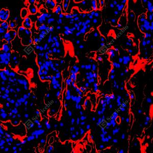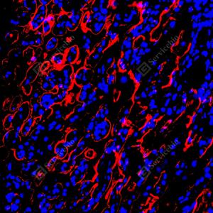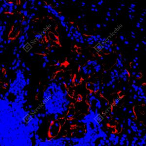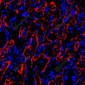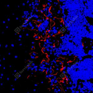 | IF检测Osteopontin蛋白(货号 GB120020)(红色). 样品: 大鼠骨, 4%多聚甲醛 (货号G1101) 固定12-24小时. 抗原修复: Tris-EDTA抗原修复液(pH 9.0) (G1203), 98℃, 20分钟. 封闭: 3% BSA(货号GC305010)的PBS溶液, 室温孵育30分钟. —抗: 1: 500稀释, 4℃ 孵育过夜. 二抗: Cy3标记山羊抗小鼠IgG (H+L) (货号GB21301), 1: 300稀释, 室温孵育1小时. |