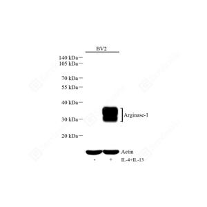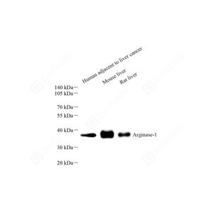 WB检测Arginase 1蛋白(货号 GB115724). 样品: 经RIPA裂解液(货号G2002)处理的蛋白质. 封闭: 3%脱脂牛奶(货号GC310001)溶于TBST溶液, 室温孵育1小时. —抗: 1: 1000稀释, 4℃ 孵育过夜. 二抗: HRP标记山羊抗兔IgG (H+L) (货号GB23303), 1: 5000稀释, 室温孵育1小时. |
