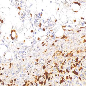 IHC检测Arginase 1蛋白(货号 GB115724). 样品: 大鼠受损皮肤, 4%多聚甲醛 (货号G1101) 固定12-24小时. 抗原修复: 柠檬酸抗原修复液(干粉, pH 6.0) (G1201), 98℃, 20分钟. —抗: 1: 1000稀释, 4℃ 孵育过夜. 二抗: S-vision免疫组化多聚二抗(山羊抗兔),即用型 (货号G1302), 室温孵育20分钟. |