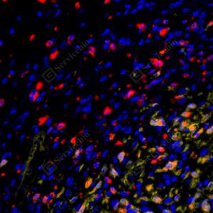 IF analysis of Arginase 1 (GB115724) yellow. sample: Mouse damaged skin, 4% PFA (G1101) 12-24h. Antigen retrieval: TE buffer (pH 9.0) (G1203), 98℃, 20min. Blocking buffer: 3% BSA in PBS (GC305010), RT, 30min. Primary antibody: Arginase 1 (GB115724) yellow 1: 2500, 4℃ overnight.HRP Goat Anti-Rabbit lgG (GB23303)+iF647-Tyramide(G1232). CD68 (GB113109) red 1: 1000, 4℃ overnight, Cy3 conjugated Goat Anti-Rabbit IgG (21303)+iF546-Tyramide(G1251). |