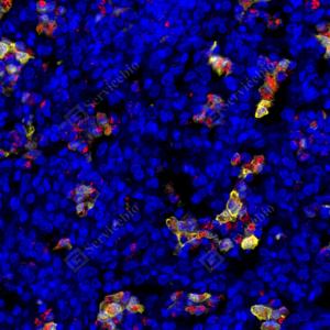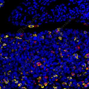 IF analysis of Arginase 1 (GB115724) yellow. sample: Mouse In situ tumor model of Lewis cell, 4% PFA (G1101) 12-24h. Antigen retrieval: TE buffer (pH 9.0) (G1203), 98℃, 20min. Blocking buffer: 3% BSA in PBS (GC305010), RT, 30min. Primary antibody: Arginase 1 (GB115724) yellow 1: 2500, 4℃ overnight.HRP Goat Anti-Rabbit lgG (GB23303)+iF647-Tyramide(G1232). CD68 (GB113109) red 1: 1000, 4℃ overnight, Cy3 conjugated Goat Anti-Rabbit IgG (21303)+iF546-Tyramide(G1251). |