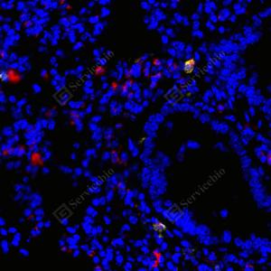 IF analysis of Arginase 1 (GB115724) yellow. sample: Mouse lung injury, 4% PFA (G1101) 12-24h. Antigen retrieval: TE buffer (pH 9.0) (G1203), 98℃, 20min. Blocking buffer: 3% BSA in PBS (GC305010), RT, 30min. Primary antibody: Arginase 1 (GB115724) yellow 1: 2500, 4℃ overnight.HRP Goat Anti-Rabbit lgG (GB23303)+iF647-Tyramide(G1232). CD68 (GB113109) red 1: 1000, 4℃ overnight, Cy3 conjugated Goat Anti-Rabbit IgG (21303)+iF546-Tyramide(G1251). |