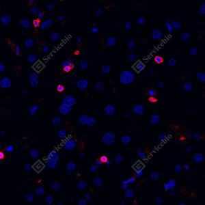 IF检测CD45蛋白(货号 GB115428)(红色). 样品: 人肝, 4%多聚甲醛 (货号G1101) 固定12-24小时. 抗原修复: Tris-EDTA抗原修复液(pH 9.0) (G1203), 98℃, 20分钟. 封闭: 3% BSA(货号GC305010)的PBS溶液, 室温孵育30分钟. —抗: 1: 200稀释, 4℃ 孵育过夜. 二抗: Cy3标记山羊抗兔IgG (H+L) (货号GB21303), 1: 300稀释, 室温孵育1小时. |
