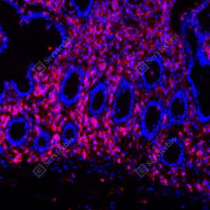 IF检测CD45蛋白(货号 GB115428)(红色). 样品: 人小肠, 4%多聚甲醛 (货号G1101) 固定12-24小时. 抗原修复: Tris-EDTA抗原修复液(pH 9.0) (G1203), 98℃, 20分钟. 封闭: 3% BSA(货号GC305010)的PBS溶液, 室温孵育30分钟. —抗: 1: 200稀释, 4℃ 孵育过夜. 二抗: Cy3标记山羊抗兔IgG (H+L) (货号GB21303), 1: 300稀释, 室温孵育1小时. |