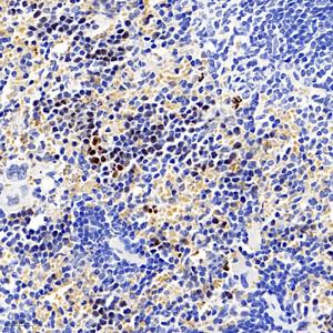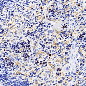 | IHC检测Phospho-H2A.X (S139)蛋白(货号 GB111841). 样品: 小鼠脾, 4%多聚甲醛 (货号G1101) 固定12-24小时. 抗原修复: Tris-EDTA抗原修复液 (pH 9.0) (G1203), 98℃, 20分钟. —抗: 1: 250稀释, 4℃ 孵育过夜. 二抗: HRP标记山羊抗兔IgG (H+L) (货号GB23303), 1: 200稀释, 室温孵育1小时. |