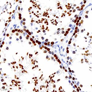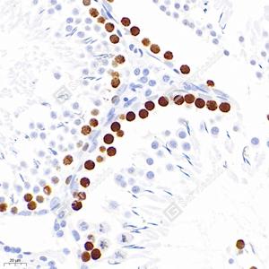 | IHC检测Phospho-H2A.X (S139)蛋白(货号 GB111841). 样品: 大鼠睾丸, 4%多聚甲醛 (货号G1101) 固定12-24小时. 抗原修复: Tris-EDTA抗原修复液 (pH 9.0) (G1203), 98℃, 20分钟. —抗: 1: 250稀释, 4℃ 孵育过夜. 二抗: HRP标记山羊抗兔IgG (H+L) (货号GB23303), 1: 200稀释, 室温孵育1小时. |