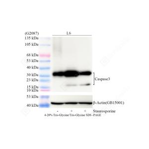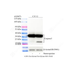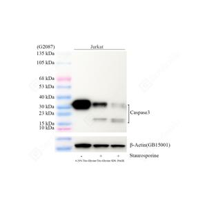 WB检测Caspase-3蛋白(货号 GB155600). 样品: 经RIPA裂解液(货号G2002)处理的蛋白质. 封闭: 3%脱脂牛奶(货号GC310001)溶于TBST溶液, 室温孵育1小时. —抗: 1: 700稀释, 4℃ 孵育过夜. 二抗: HRP标记山羊抗兔IgG (H+L) (货号GB23303), 1: 5000稀释, 室温孵育1小时. |