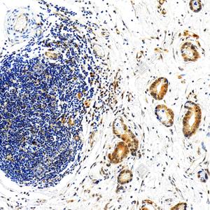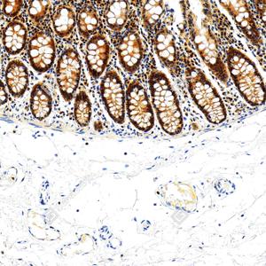 IHC检测Caspase-3蛋白(货号 GB155600). 样品: 人结肠, 4%多聚甲醛 (货号G1101) 固定12-24小时. 抗原修复: Tris-EDTA抗原修复液(pH 9.0) (G1203), 98℃, 20分钟. —抗: 1: 1400稀释, 4℃ 孵育过夜. 二抗: S-vision免疫组化多聚二抗(山羊抗兔),即用型 (货号G1302), 室温孵育20分钟. |