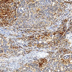 IHC检测Caspase-3蛋白(货号 GB155600). 样品: 人卵巢癌, 4%多聚甲醛 (货号G1101) 固定12-24小时. 抗原修复: Tris-EDTA抗原修复液(pH 9.0) (G1203), 98℃, 20分钟. —抗: 1: 1400稀释, 4℃ 孵育过夜. 二抗: S-vision免疫组化多聚二抗(山羊抗兔),即用型 (货号G1302), 室温孵育20分钟. |