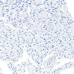 IHC检测 Caspase-3蛋白(货号 GB155600). 样品: 小鼠心, 4%多聚甲醛 (货号G1101) 固定12-24小时. 抗原修复: Tris-EDTA抗原修复液(pH 9.0) (G1203), 98℃, 20分钟. —抗: 1: 1400稀释, 4℃ 孵育过夜. 二抗: S-vision免疫组化多聚二抗(山羊抗兔),即用型 (货号G1302), 室温孵育20分钟. |