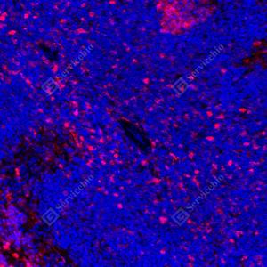 IF检测 Caspase-3蛋白(货号 GB155600)(红色). 样品: 小鼠脾, 4%多聚甲醛 (货号G1101) 固定12-24小时. 抗原修复: Tris-EDTA抗原修复液(pH 9.0) (G1203), 98℃, 20分钟. —抗: 1: 1400稀释, 4℃ 孵育过夜. 二抗: Cy3标记山羊抗兔IgG (H+L) (货号GB21303), 1: 300稀释, 室温孵育1小时. |