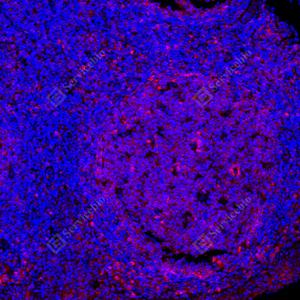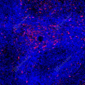 IF检测Caspase-3蛋白(货号 GB155600)(红色). 样品: 大鼠脾, 4%多聚甲醛 (货号G1101) 固定12-24小时. 抗原修复: Tris-EDTA抗原修复液(pH 9.0) (G1203), 98℃, 20分钟. —抗: 1: 1400稀释, 4℃ 孵育过夜. 二抗: Cy3标记山羊抗兔IgG (H+L) (货号GB21303), 1: 300稀释, 室温孵育1小时. |