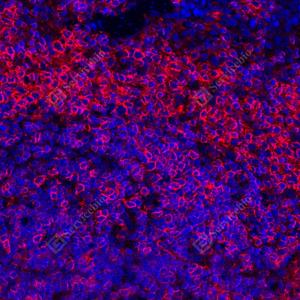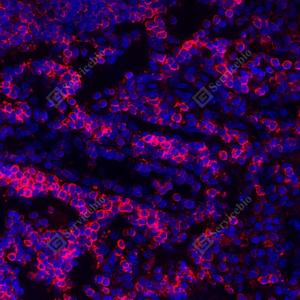 | IF检测CD45蛋白(货号 GB113886)(红色). 样品: 小鼠抗原刺激模型淋巴结, 4%多聚甲醛 (货号G1101) 固定12-24小时. 抗原修复: Tris-EDTA抗原修复液(pH 9.0) (G1203), 98℃, 20分钟. 封闭: 3% BSA(货号GC305010)的PBS溶液, 室温孵育30分钟. —抗: 1: 300稀释, 4℃ 孵育过夜. 二抗: Cy3标记山羊抗兔IgG (H+L) (货号GB21303), 1: 300稀释, 室温孵育1小时. |