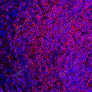 | IF检测CD45蛋白(货号 GB113886)(红色). 样品: 大鼠淋巴, 4%多聚甲醛 (货号G1101) 固定12-24小时. 抗原修复: Tris-EDTA抗原修复液(pH 9.0) (G1203), 98℃, 20分钟. 封闭: 3% BSA(货号GC305010)的PBS溶液, 室温孵育30分钟. —抗: 1: 300稀释, 4℃ 孵育过夜. 二抗: Cy3标记山羊抗兔IgG (H+L) (货号GB21303), 1: 300稀释, 室温孵育1小时. |