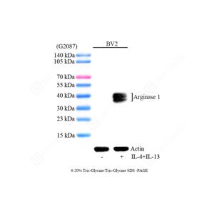 | WB检测Arginase 1蛋白(货号 GB15285). 样品: 经RIPA裂解液(货号G2002)处理的蛋白质. 封闭: 3%脱脂牛奶(货号GC310001)溶于TBST溶液, 室温孵育1小时. —抗: 1: 1000稀释, 4℃ 孵育过夜. 二抗: HRP标记山羊抗兔IgG (H+L) (货号GB23303), 1: 5000稀释, 室温孵育1小时. |