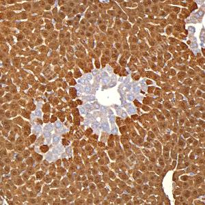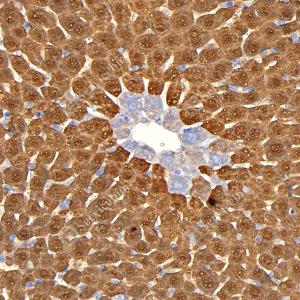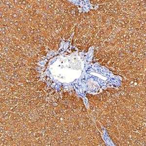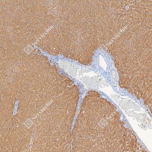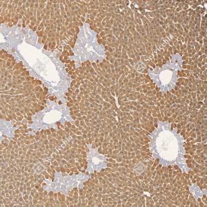 | IHC检测Arginase 1蛋白(货号 GB15285). 样品: 小鼠肝, 4%多聚甲醛 (货号G1101) 固定12-24小时. 抗原修复: 柠檬酸抗原修复液(干粉, pH 6.0) (G1201), 高压锅均匀喷气计时2分钟. —抗: 1: 1000稀释, 4℃ 孵育过夜. 二抗: S-vision免疫组化多聚二抗(山羊抗兔),即用型 (货号G1302), 室温孵育20分钟. |