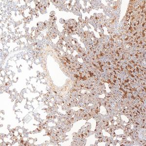 | IHC检测Arginase 1蛋白(货号 GB15285). 样品: 小鼠肺损伤, 4%多聚甲醛 (货号G1101) 固定12-24小时. 抗原修复: 柠檬酸抗原修复液(干粉, pH 6.0) (G1201), 高压锅均匀喷气计时2分钟. —抗: 1: 1000稀释, 4℃ 孵育过夜. 二抗: S-vision免疫组化多聚二抗(山羊抗兔),即用型 (货号G1302), 室温孵育20分钟. |