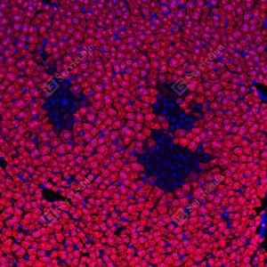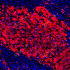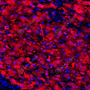 | IF检测Arginase 1蛋白(货号 GB15285)(红色). 样品: 人肝癌, 4%多聚甲醛 (货号G1101) 固定12-24小时. 抗原修复: 柠檬酸抗原修复液(干粉, pH 6.0) (G1201), 高压锅均匀喷气计时2分钟. 封闭: 3% BSA(货号GC305010)的PBS溶液, 室温孵育30分钟. —抗: 1: 1000稀释, 4℃ 孵育过夜. 二抗: Cy3标记山羊抗兔IgG (H+L) (货号GB21303), 1: 300稀释, 室温孵育1小时. |