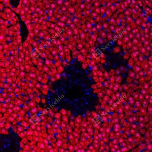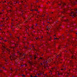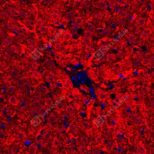 | IF检测Arginase 1蛋白(货号 GB15285)(红色). 样品: 大鼠肝, 4%多聚甲醛 (货号G1101) 固定12-24小时. 抗原修复: 柠檬酸抗原修复液(干粉, pH 6.0) (G1201), 高压锅均匀喷气计时2分钟. 封闭: 3% BSA(货号GC305010)的PBS溶液, 室温孵育30分钟. —抗: 1: 1000稀释, 4℃ 孵育过夜. 二抗: Cy3标记山羊抗兔IgG (H+L) (货号GB21303), 1: 300稀释, 室温孵育1小时. |