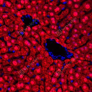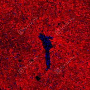| IF检测Arginase 1蛋白(货号 GB15285)(红色). 样品: 小鼠肝, 4%多聚甲醛 (货号G1101) 固定12-24小时. 抗原修复: 柠檬酸抗原修复液(干粉, pH 6.0) (G1201), 高压锅均匀喷气计时2分钟. 封闭: 3% BSA(货号GC305010)的PBS溶液, 室温孵育30分钟. —抗: 1: 1000稀释, 4℃ 孵育过夜. 二抗: Cy3标记山羊抗兔IgG (H+L) (货号GB21303), 1: 300稀释, 室温孵育1小时. |