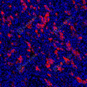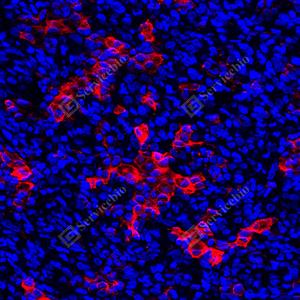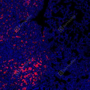 | IF检测Arginase 1蛋白(货号 GB15285)(红色). 样品: 大鼠肺损伤, 4%多聚甲醛 (货号G1101) 固定12-24小时. 抗原修复: 柠檬酸抗原修复液(干粉, pH 6.0) (G1201), 高压锅均匀喷气计时2分钟. 封闭: 3% BSA(货号GC305010)的PBS溶液, 室温孵育30分钟. —抗: 1: 1000稀释, 4℃ 孵育过夜. 二抗: Cy3标记山羊抗兔IgG (H+L) (货号GB21303), 1: 300稀释, 室温孵育1小时. |