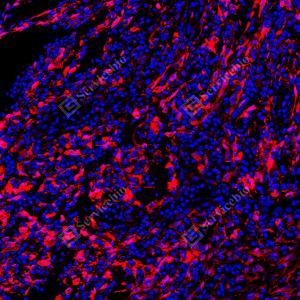 | IF检测Arginase 1蛋白(货号 GB15285)(红色). 样品: 人结肠癌, 4%多聚甲醛 (货号G1101) 固定12-24小时. 抗原修复: 柠檬酸抗原修复液(干粉, pH 6.0) (G1201), 高压锅均匀喷气计时2分钟. 封闭: 3% BSA(货号GC305010)的PBS溶液, 室温孵育30分钟. —抗: 1: 1000稀释, 4℃ 孵育过夜. 二抗: Cy3标记山羊抗兔IgG (H+L) (货号GB21303), 1: 300稀释, 室温孵育1小时. |