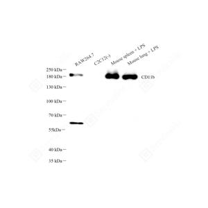 WB检测CD11b蛋白(货号 GB115689). 样品: 经RIPA裂解液(货号G2002)处理的蛋白质. 封闭: 3%脱脂牛奶(货号GC310001)溶于TBST溶液, 室温孵育1小时. —抗: 1: 250稀释, 4℃ 孵育过夜. 二抗: HRP标记山羊抗兔IgG (H+L) (货号GB23303), 1: 5000稀释, 室温孵育1小时. |