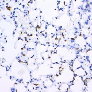 IHC检测CD11b蛋白(货号 GB115689). 样品: 小鼠脂多糖诱导(24小时)的肺部炎症模型, 4%多聚甲醛 (货号G1101) 固定12-24小时. 抗原修复: 柠檬酸抗原修复液(干粉, pH 6.0) (G1201), 98℃, 20分钟. —抗: 1: 500稀释, 4℃ 孵育过夜. 二抗: HRP标记山羊抗兔IgG (H+L) (货号GB23303), 1: 200稀释, 室温孵育1小时. |