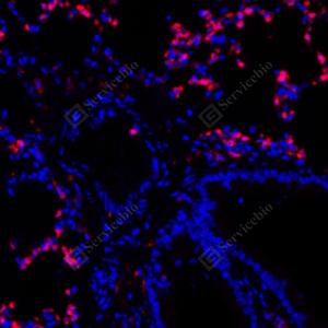 IF检测CD11b蛋白(货号 GB115689)(红色). 样品: 小鼠脂多糖诱导(24小时)的肺部炎症模型, 4%多聚甲醛 (货号G1101) 固定12-24小时. 抗原修复: Tris-EDTA抗原修复液 (pH 9.0) (G1203), 98℃, 20分钟. 封闭: 3% BSA(货号GC305010)的PBS溶液, 室温孵育30分钟. —抗: 1: 500, 4℃ 孵育过夜. 二抗: Cy3标记山羊抗兔IgG (H+L) (货号GB21303), 1: 300稀释, 室温孵育1小时. |