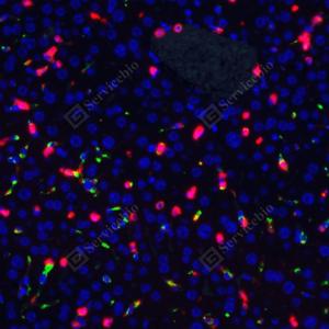 IF analysis of CD11b (GB115689)red. sample: Mouse Inflammatory model induced by lps(24h) liver, 4% PFA (G1101) 12-24h. Blocking buffer: 3% BSA in PBS (GC305010), RT, 30min. Primary antibody: CD11b (GB115689) red 1: 2500, 4℃ overnight.HRP Goat Anti-Rabbit lgG (GB23303)+cy3-TSA(G1223). CD68 (GB113109) green 1: 200,4℃ overnight, 488 Goat Anti-Rabbit lgG(GB25303). |