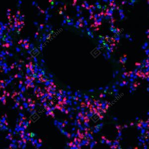 IF analysis of CD11b (GB115689)red. sample: Mouse Inflammatory model induced by lps(24h) lung, 4% PFA (G1101) 12-24h. Blocking buffer: 3% BSA in PBS (GC305010), RT, 30min. Primary antibody: CD11b (GB115689)red 1: 2500, 4℃ overnight.HRP Goat Anti-Rabbit lgG (GB23303)+cy3-TSA(G1223). CD68 (GB113109) green 1: 200,4℃ overnight, 488 Goat Anti-Rabbit lgG(GB25303). |