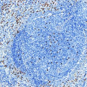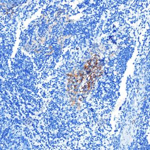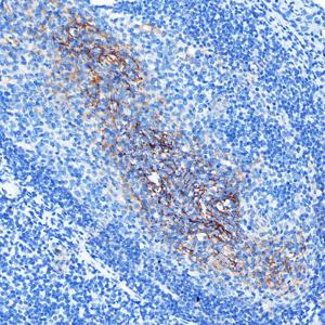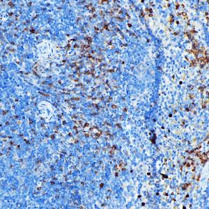 IHC检测CD11b蛋白(货号 GB12058). 样品: 人扁桃体, 4%多聚甲醛 (货号G1101) 固定12-24小时. 抗原修复: 柠檬酸抗原修复液(干粉, pH 6.0) (G1201), 高压锅均匀喷气计时2分钟. —抗: 1: 500稀释, 4℃ 孵育过夜. 二抗: S-vision免疫组化多聚二抗(山羊抗小鼠), 即用型(货号G1301), 室温孵育20分钟. |