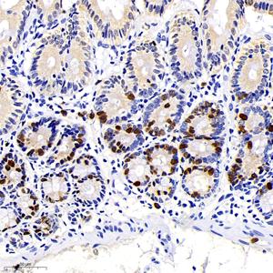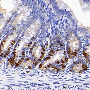 | IHC检测BrdU蛋白(货号 GB12051). 样品: 小鼠空肠, 4%多聚甲醛 (货号G1101) 固定12-24小时. 抗原修复: 用纯水配制2摩尔/升盐酸, 37℃处理30分钟使DNA变性. —抗: 1: 500稀释, 4℃ 孵育过夜. 二抗: HRP标记山羊抗小鼠IgG (H+L) (货号GB23301), 1: 200稀释, 室温孵育1小时. |
