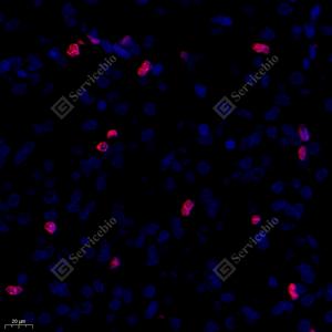 | IF检测BrdU蛋白(货号 GB12051)(红色). 样品: 小鼠新生小鼠脑, 4%多聚甲醛 (货号G1101) 固定12-24小时. 抗原修复: 用纯水配制2摩尔/升盐酸,37℃处理30分钟使DNA变性. 封闭: 3% BSA(货号GC305010)的PBS溶液, 室温孵育30分钟. —抗: 1: 500稀释, 4℃ 孵育过夜. 二抗: Cy3标记山羊抗小鼠IgG (H+L) (货号GB21301), 1: 300稀释, 室温孵育1小时. |