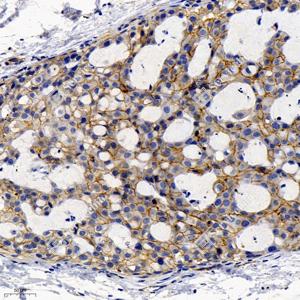 | IHC检测beta Catenin蛋白(货号 GB12016). 样品: 人乳腺癌, 4%多聚甲醛 (货号G1101) 固定12-24小时. 抗原修复: 柠檬酸抗原修复液(干粉, pH 6.0) (G1201), 高压锅均匀喷气计时2分钟. —抗: 1: 1000稀释, 4℃ 孵育过夜. 二抗: HRP标记山羊抗小鼠IgG (H+L) (货号GB23301), 1: 200稀释, 室温孵育1小时. |