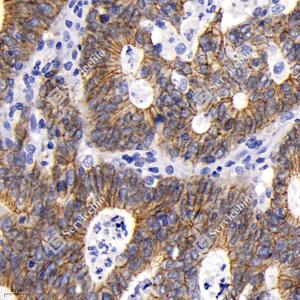 | IHC检测beta Catenin蛋白(货号 GB12016). 样品: 人结肠癌, 4%多聚甲醛 (货号G1101) 固定12-24小时. 抗原修复: 柠檬酸抗原修复液(干粉, pH 6.0) (G1201), 高压锅均匀喷气计时2分钟. —抗: 1: 1000稀释, 4℃ 孵育过夜. 二抗: HRP标记山羊抗小鼠IgG (H+L) (货号GB23301), 1: 200稀释, 室温孵育1小时. |