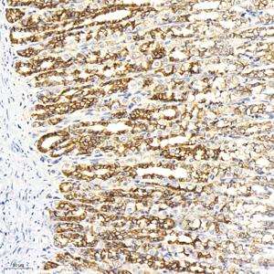 | IHC检测beta Catenin蛋白(货号 GB12016). 样品: 小鼠胃, 4%多聚甲醛 (货号G1101) 固定12-24小时. 抗原修复: 柠檬酸抗原修复液(干粉, pH 6.0) (G1201), 高压锅均匀喷气计时2分钟. —抗: 1: 1000稀释, 4℃ 孵育过夜. 二抗: HRP标记山羊抗小鼠IgG (H+L) (货号GB23301), 1: 200稀释, 室温孵育1小时. |