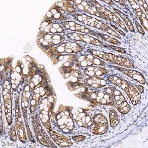 | IHC检测beta Catenin蛋白(货号 GB12016). 样品: 大鼠结肠, 4%多聚甲醛 (货号G1101) 固定12-24小时. 抗原修复: 柠檬酸抗原修复液(干粉, pH 6.0) (G1201), 高压锅均匀喷气计时2分钟. —抗: 1: 1000稀释, 4℃ 孵育过夜. 二抗: HRP标记山羊抗小鼠IgG (H+L) (货号GB23301), 1: 200稀释, 室温孵育1小时. |
